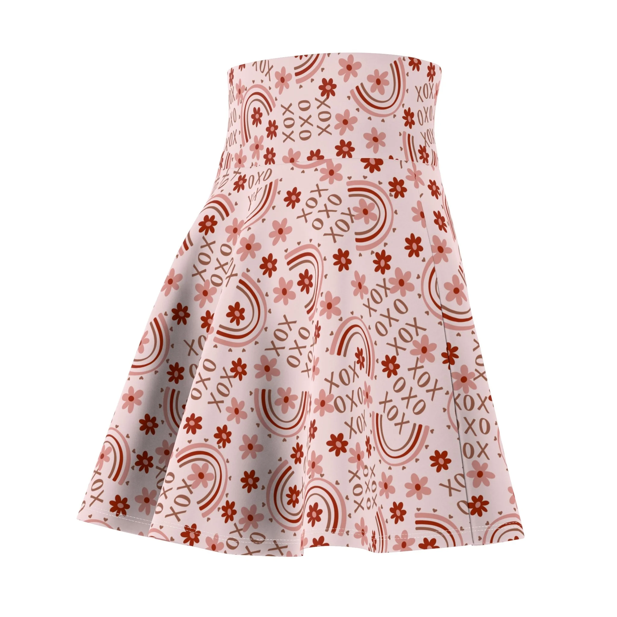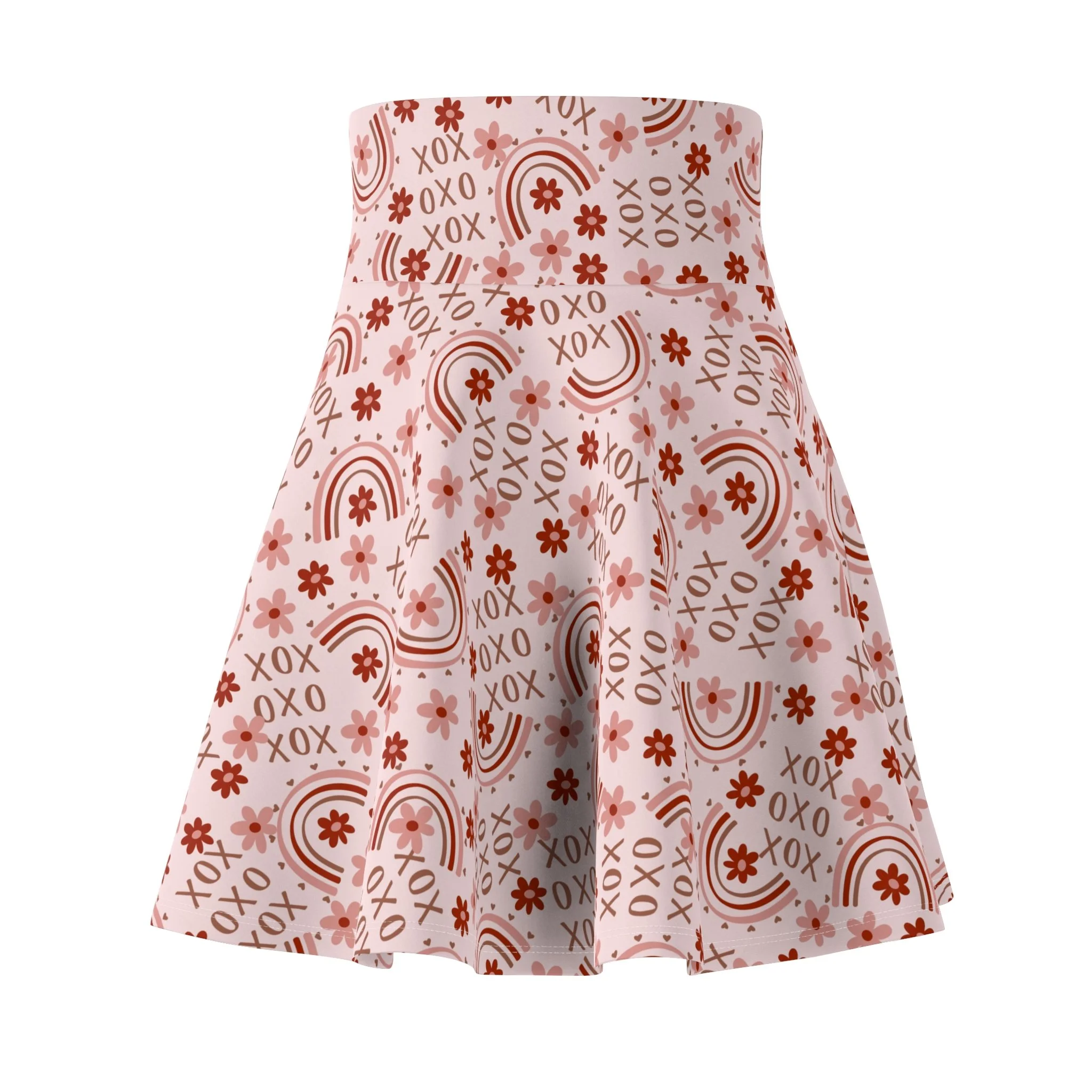 Light, playful, and made to move — this flared skater skirt carries a soft blush background scattered with warm terracotta rainbows, tiny florals, and little XOXO motifs. The high-rise double waist sits comfortably at the natural waist and gives a smooth silhouette, while the full, twirling skirt flatters every step. It stretches in all directions so you can dance, bike, or curl up with a book without feeling restricted. Wear it layered over tights when the air turns cool, or pair it with a simple tee and sneakers for a sunny stroll. The pattern reads like an affectionate note — casual, slightly vintage, and quietly joyful — for anyone who likes a feminine, easygoing look with a handcrafted feel.